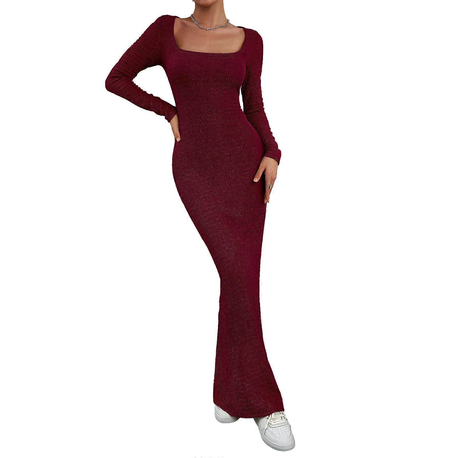 Women's Square Neck Long Sleeve Maxi Dress Knitted Bodycon Dresses Soft Long Dress Casual Slim Fitted Pencil Dress Burgundy XL