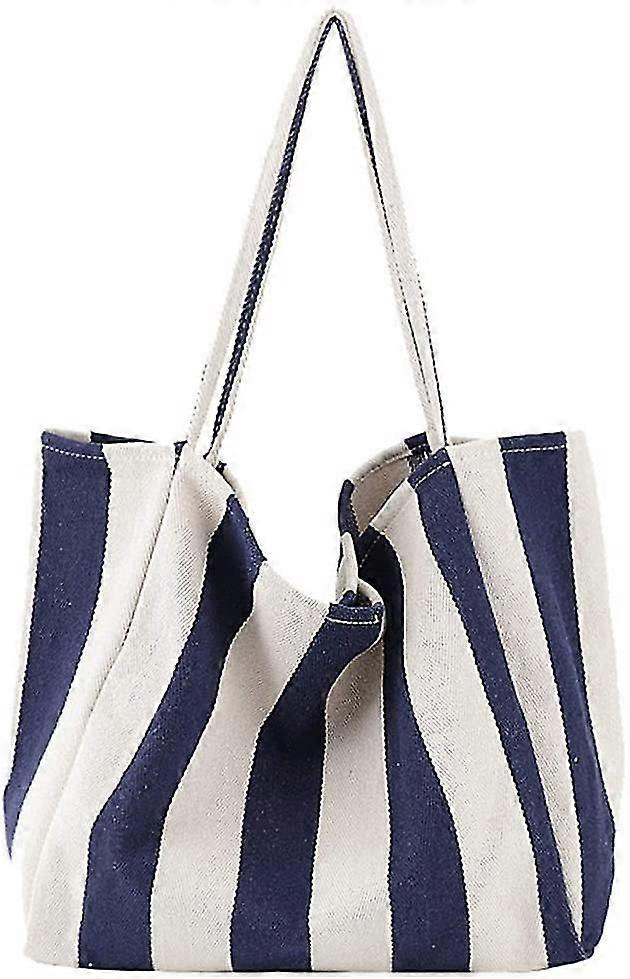 Ladies Striped Canvas Shoulder Bag, Beach Play Handbag Large Capacity Navy Blue Wide Stripes