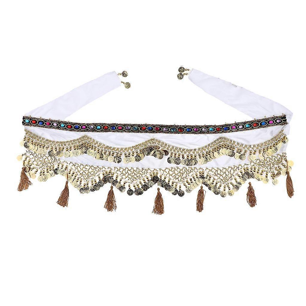 Womens Sequins Belly Dance Hip Scarf Wrap Skirt with Gold Coins White