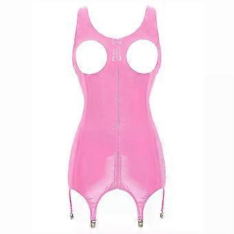 レディースセクシーなオープンカップミニドレスノースリーブウェットルックパテントレザー中空アウトドレスガータークリップ付きパーティークラブウェアナイトウェア