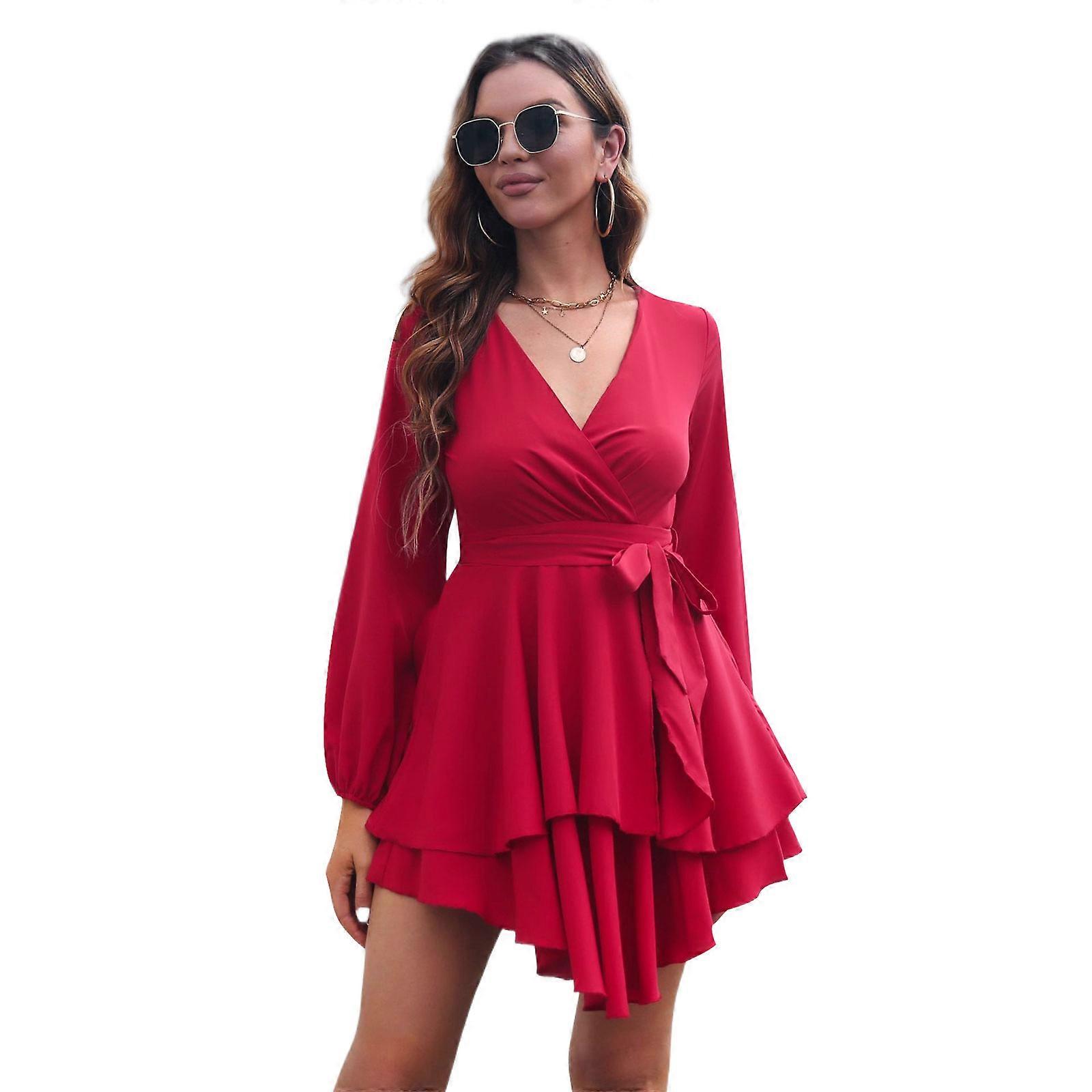 Women's Tie Waist Ruffle Dress Elegant Mini Dress Flowy Beach Dress Long Sleeves Deep V-Neck Party Dress Holiday Dress Burgundy XL