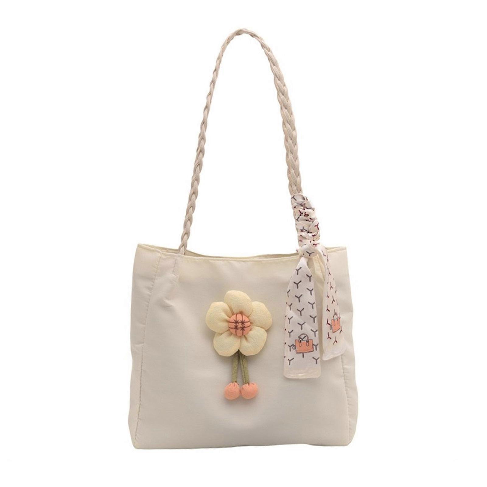Womens Bag Large Capacity Shoulder Bag Commuting Bag Nylon Handbags Flower Shopping Bag Student School Bag for Daily White