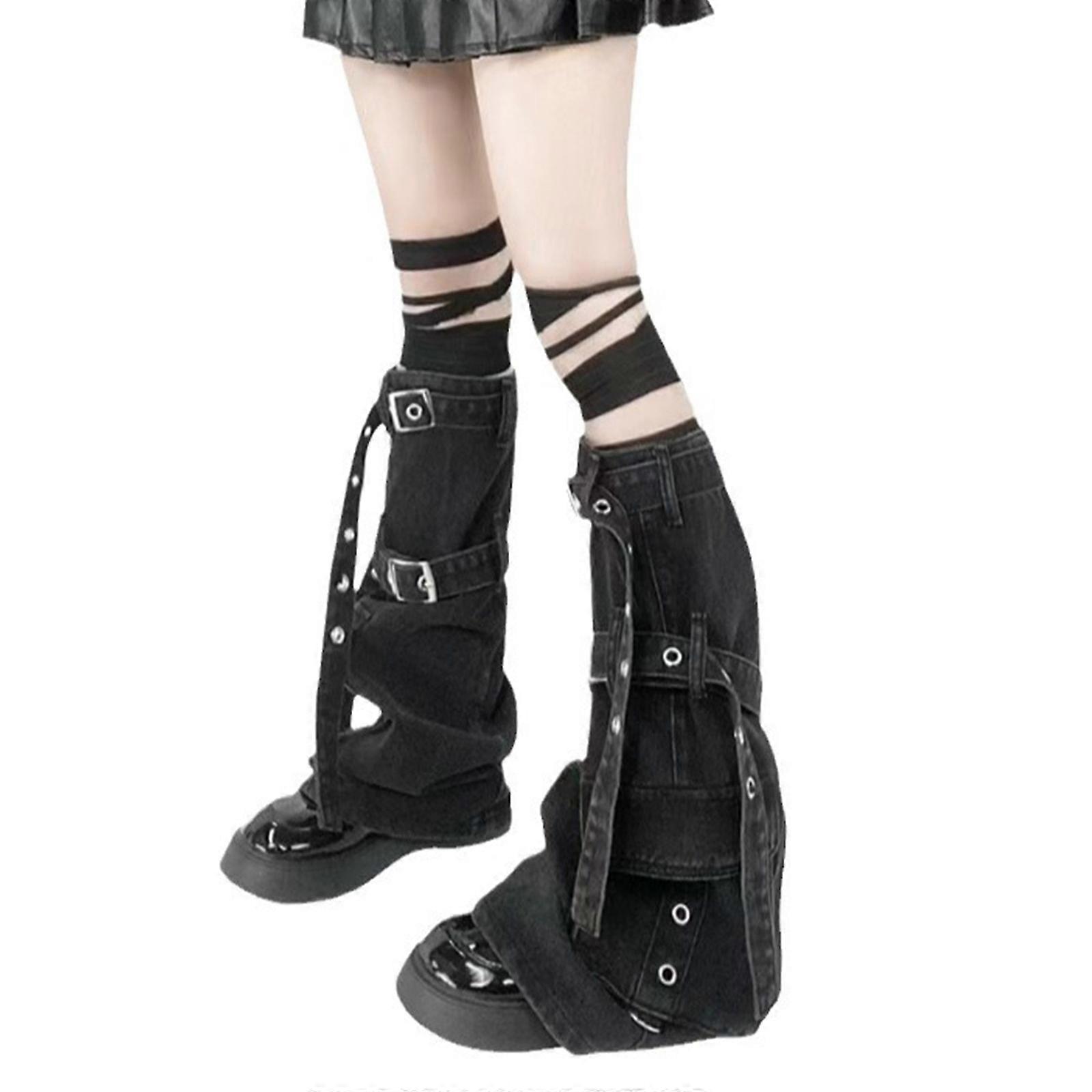 Womens Punk Denims Flared Boot Cover with Metal Buckled Straps Harajuku Cargo Jeans Leg Warmer Knee Highs Long Stockings Black