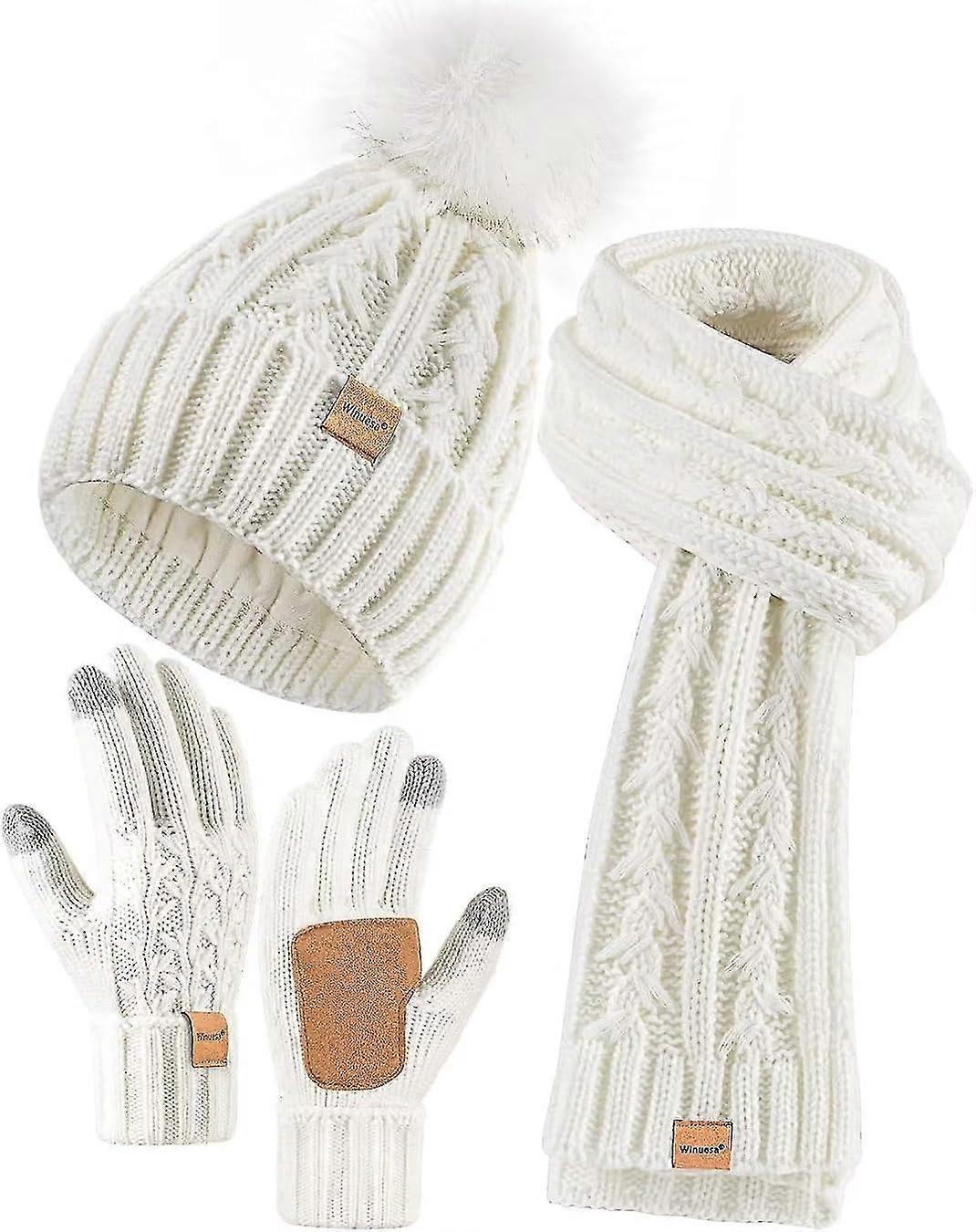 Womens Beanie Hat Scarf Gloves Set Fleece Lined Winter Hat with Pom Pom Long Knit Scarf Touchscreen