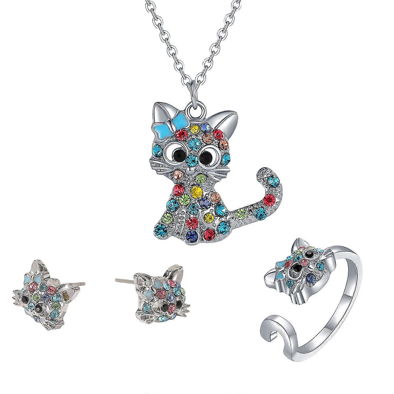 Ladies Fashion Cat Pendant Color Diamond Clavicle Necklace Ring Earring Set