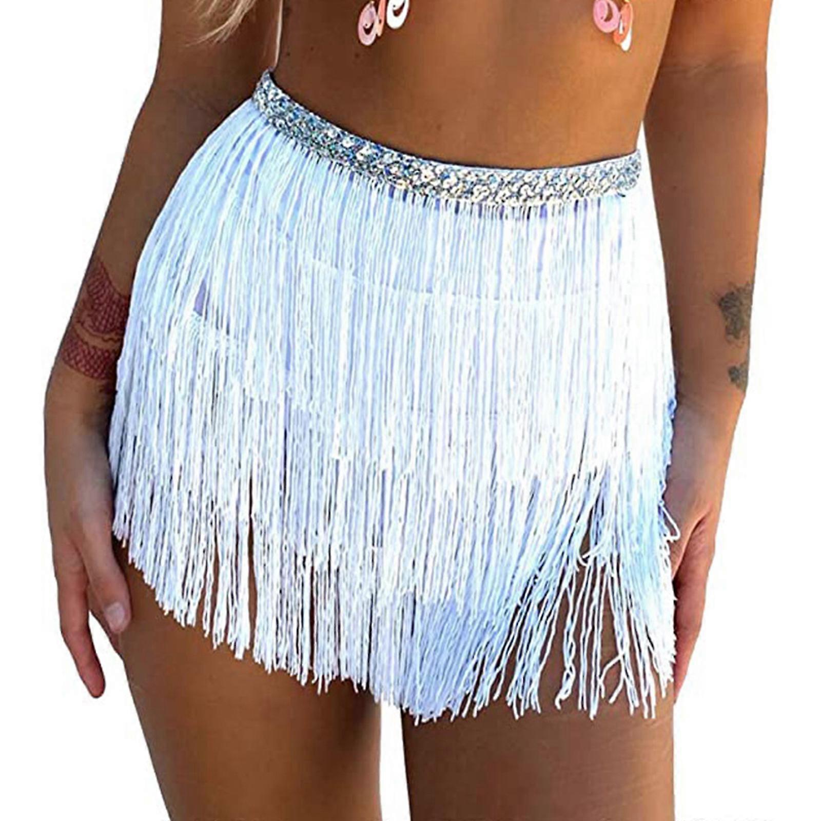 Womens Belly Dance Skirt Tassel Fringe Hip Scarf Adjustable Strappy Wrap Rave Skirts Club Festival Halloween Costume White