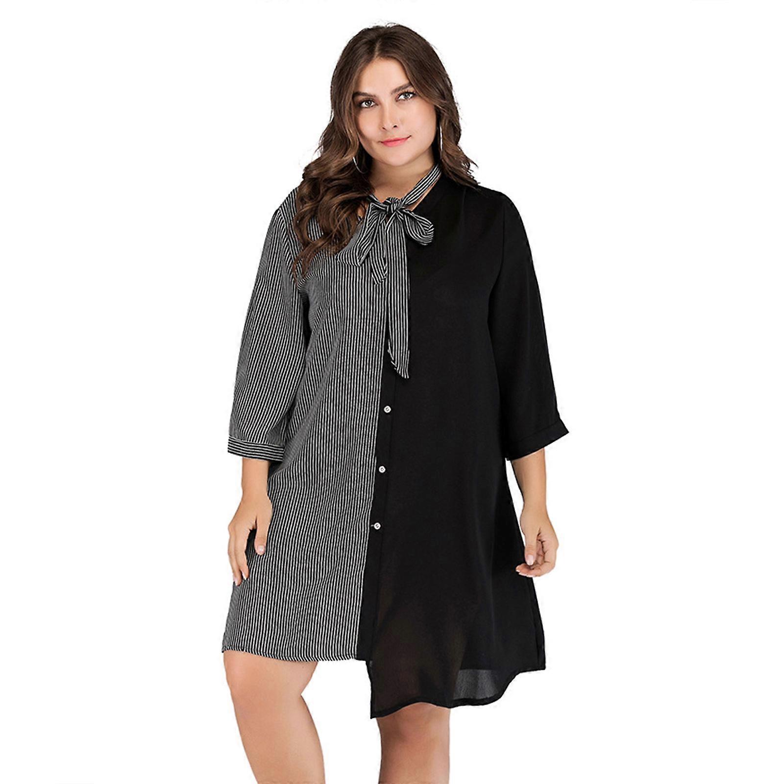 Womens Lapel V-Neck Button Midi Dress with Scarf 3/4 Sleeve Asymmetrical Striped Print Office Lady Loose Streetwear Black XL