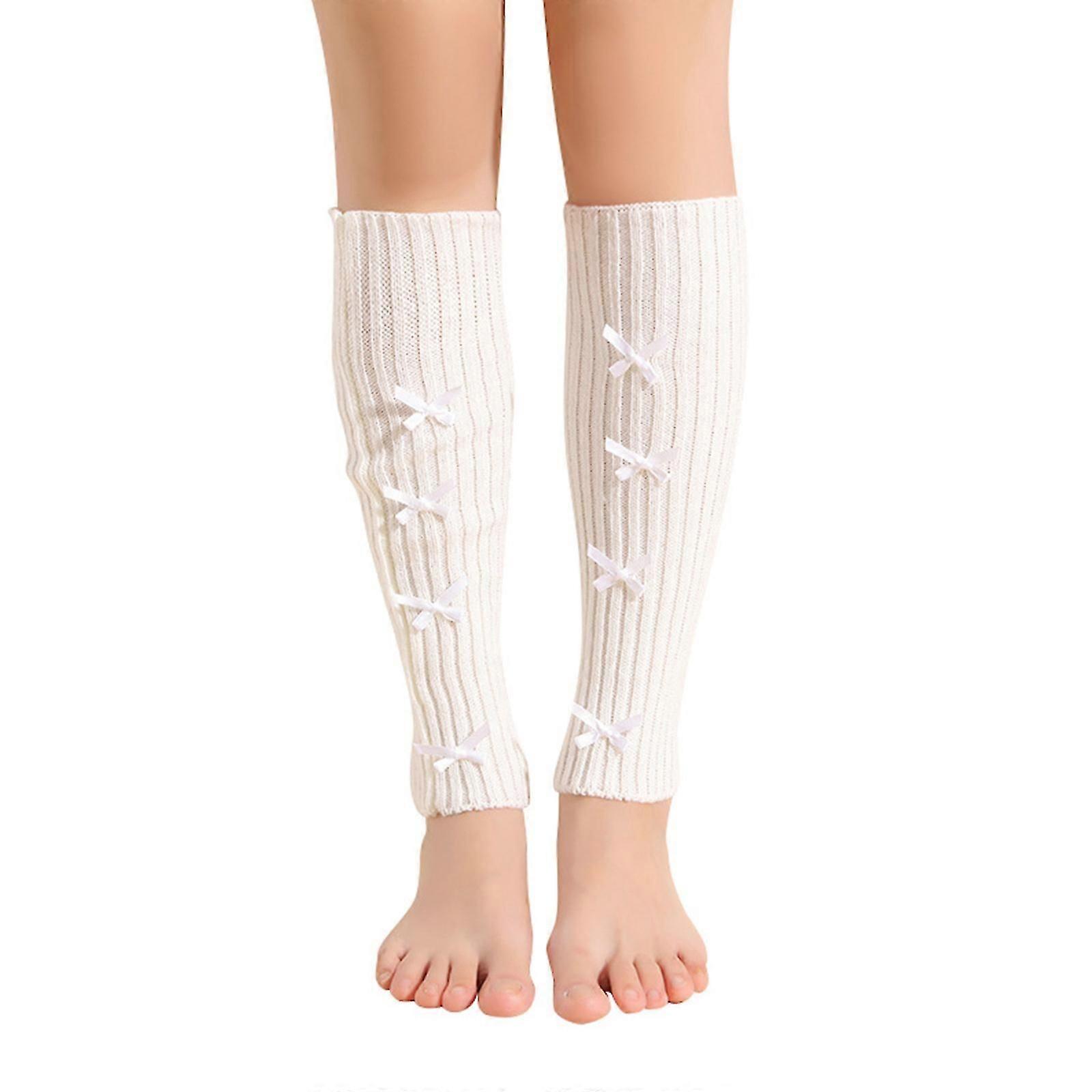 Women Girls Winter Ribbed Knit Striped Leg Warmers Harajuku Lolita Kawaii Mini Satin Bowknot Boot Cover Sleeve Preppy Style Student Calf Socks