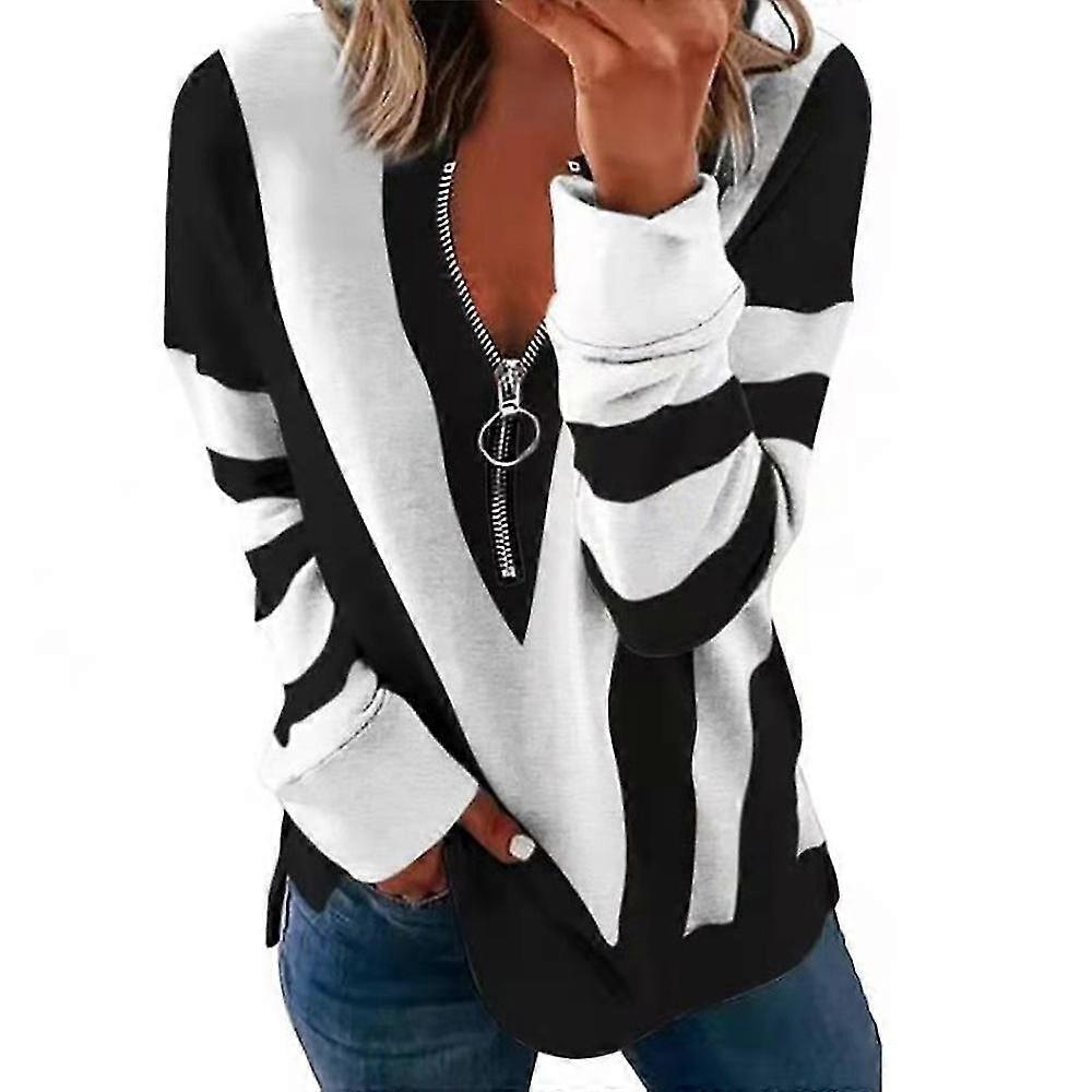 Womens Colorblock Zip V Neck Long Sleeve T-shirt Casual Loose Pullover Tops