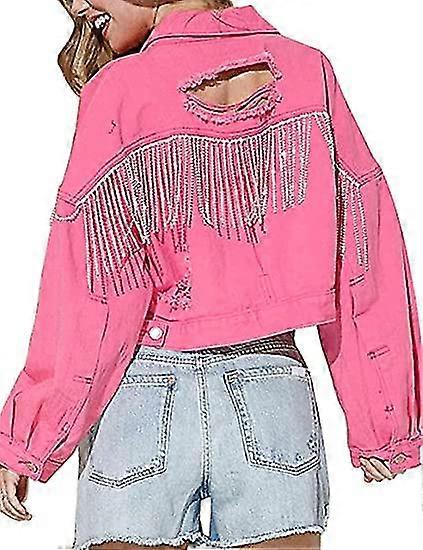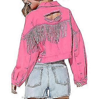 Womens Denim Jacket With Fringe Rhinestones Long Sleeve Distressed Ripped Denim Jackets With Pockets