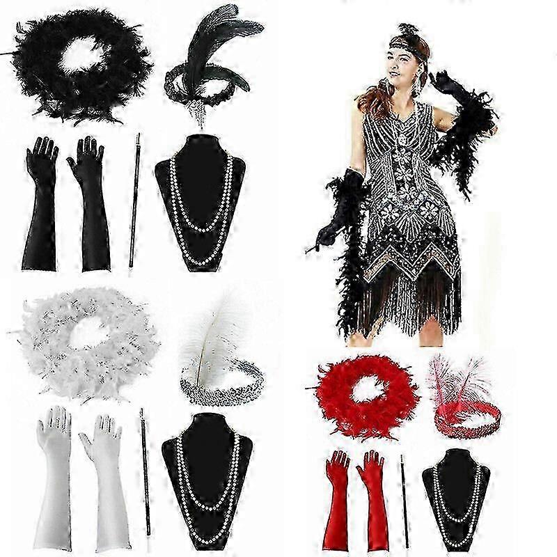 Ladies 1920s Flapper Gatsby Costume Accessories Set 20s Flapper Headband Pearl Necklace Gloves Holder