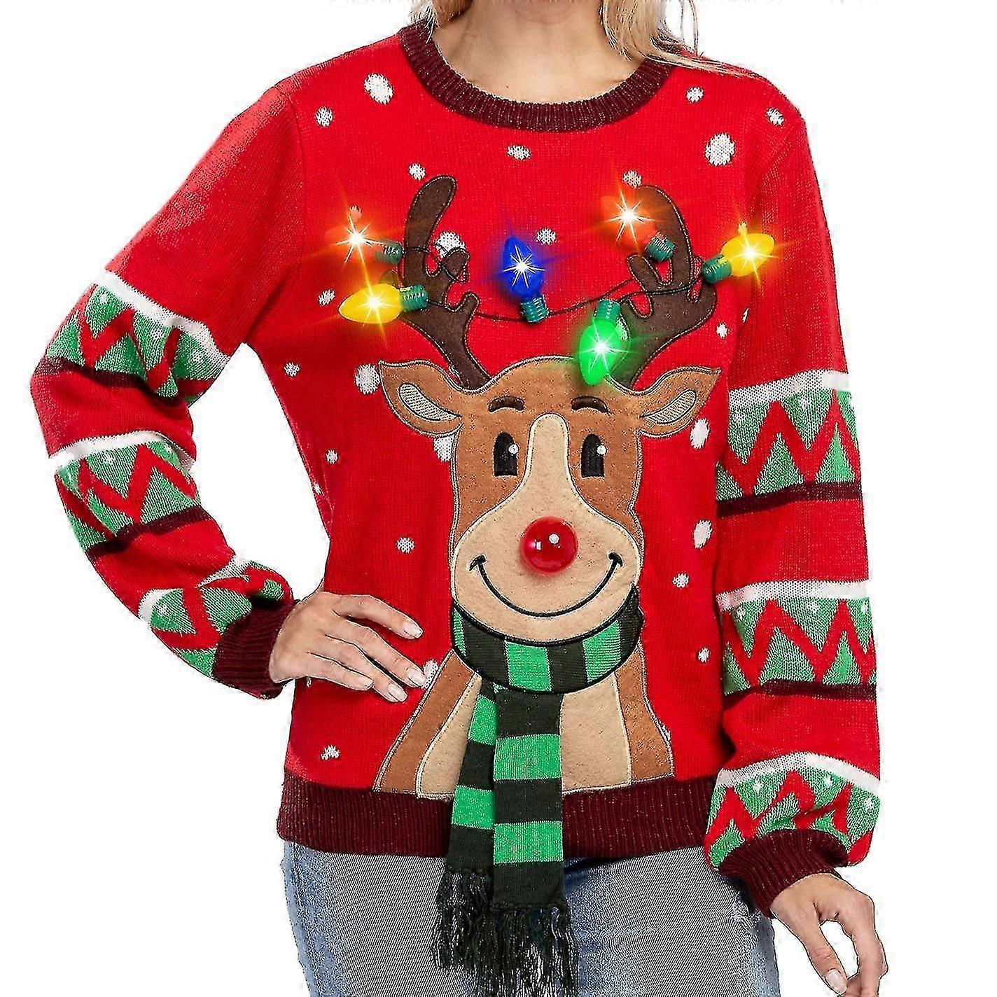 Womens LED Light Up Reindeer Ugly Christmas Sweater Built-in Light Bulbs (Medium, Red) - ya01