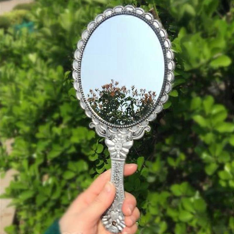 Retro Patterned Handle Cosmetic Mirror Portable Lace Mirror Handheld Mirror-Silver