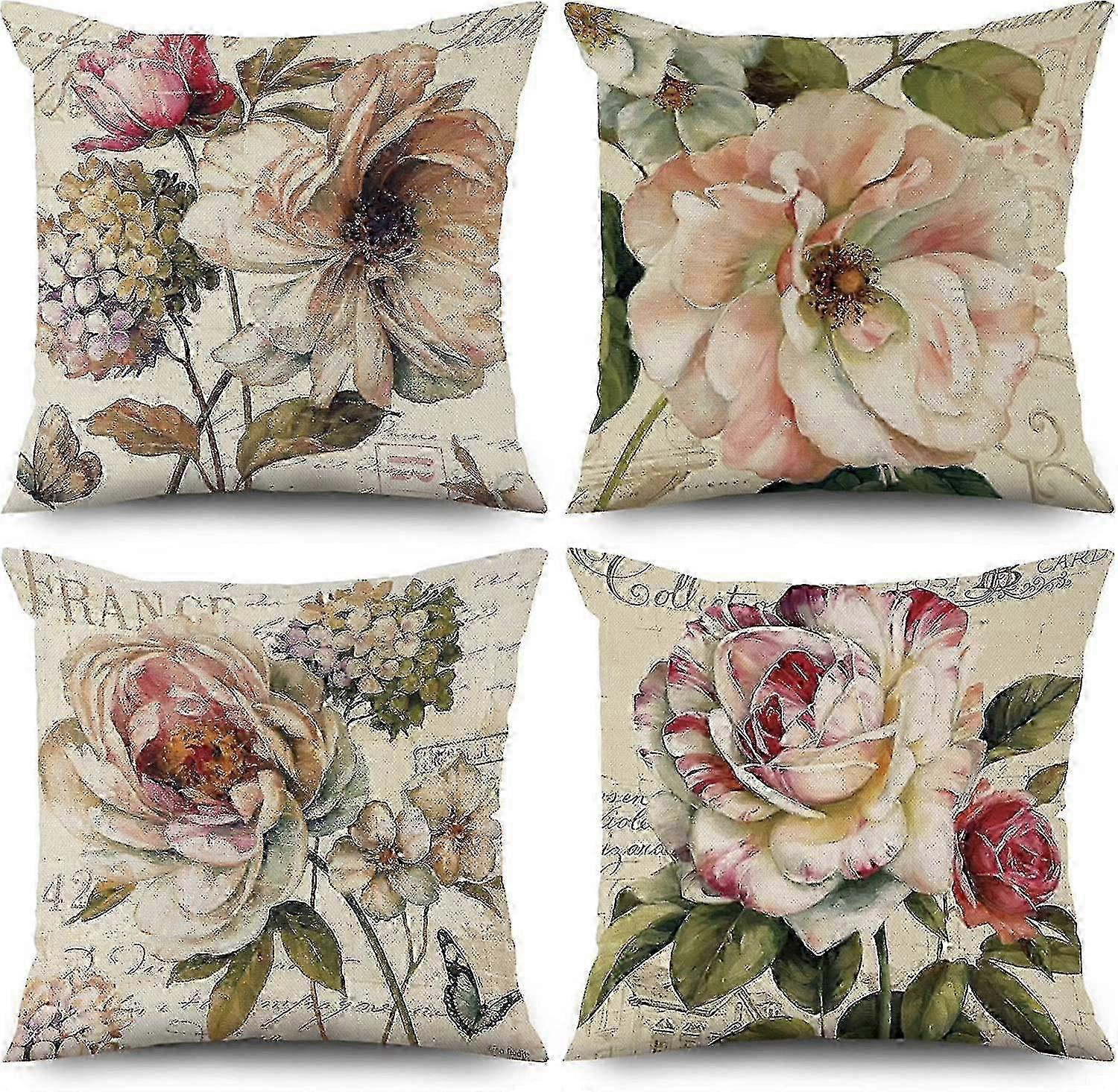 Set of 4 Retro Rose Flower Beige Sofa Cushion Washable Polyester Flax Textile Decorative - ya01 new 2025