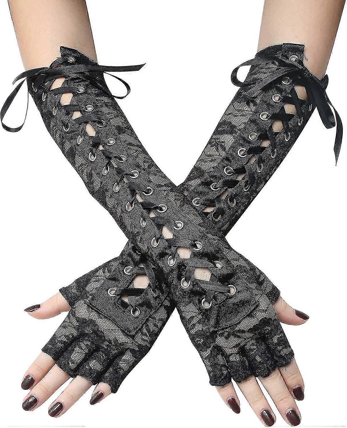 Lace Up Fingerless Gloves Long Elbow Gloves For Costume Party Lace-up Arm Warmer Lace-black -