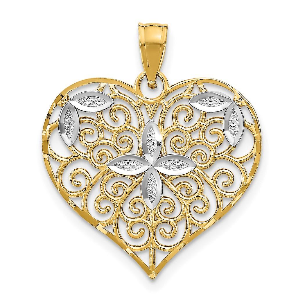 21.8mm 10k With Rhodium Cut out Filigree Flower and Love Heart Charm Pendant Necklace for Women