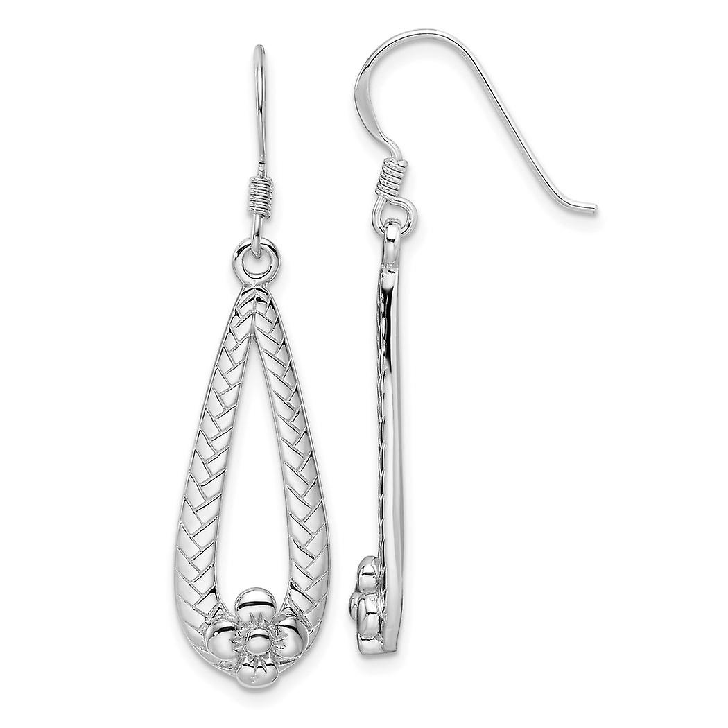 Rhodium Plated Polished Textured Teardrop With Flower Dangle Earrings 43.6x10.7mm Wide-Dangle Earring for Women