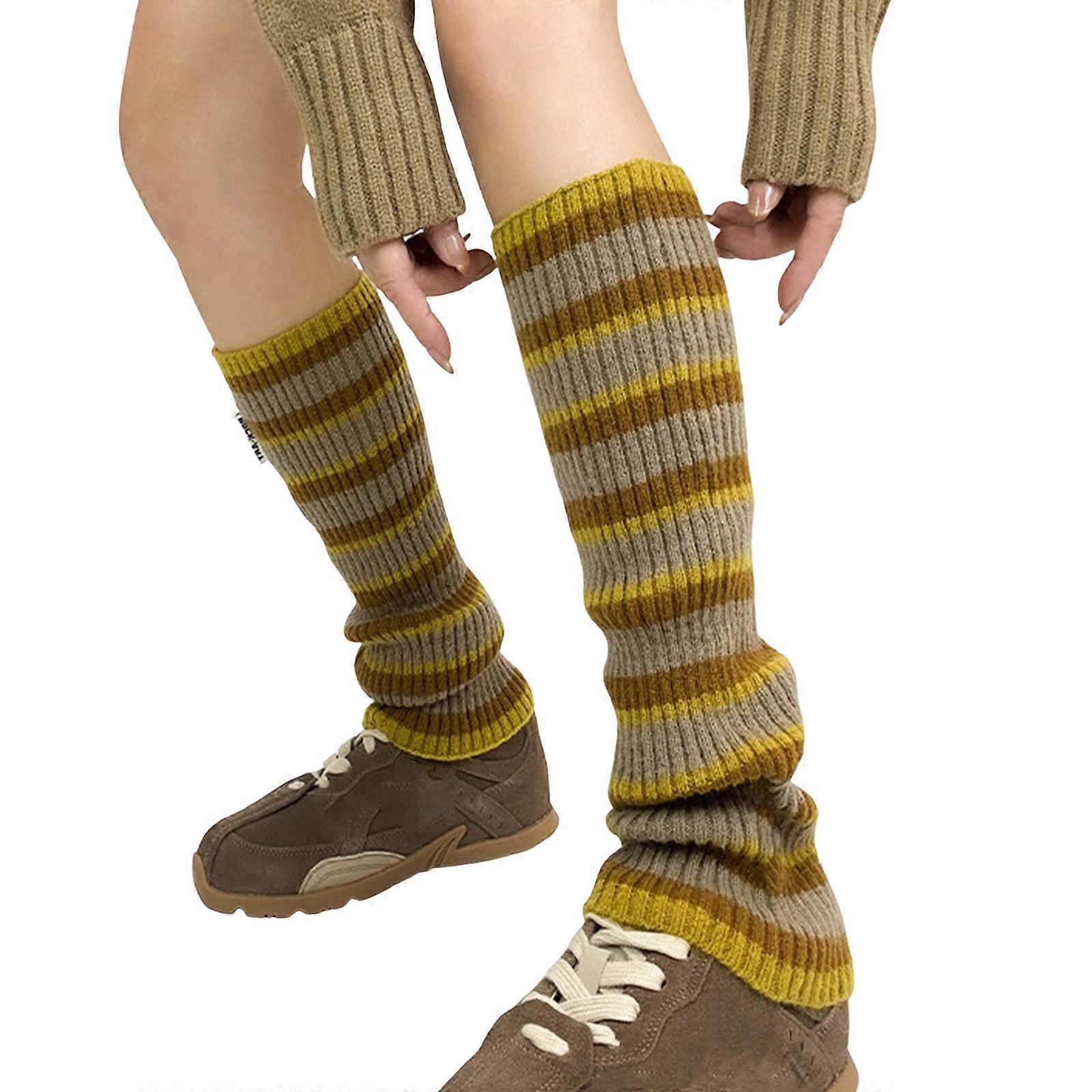 Lolitas Stripe Foot Cover Socks Winter Warm Knit Leg Warmers for Women Girls Gothic Harajuku Leg Cover Middle Tube Sock khaki stripes