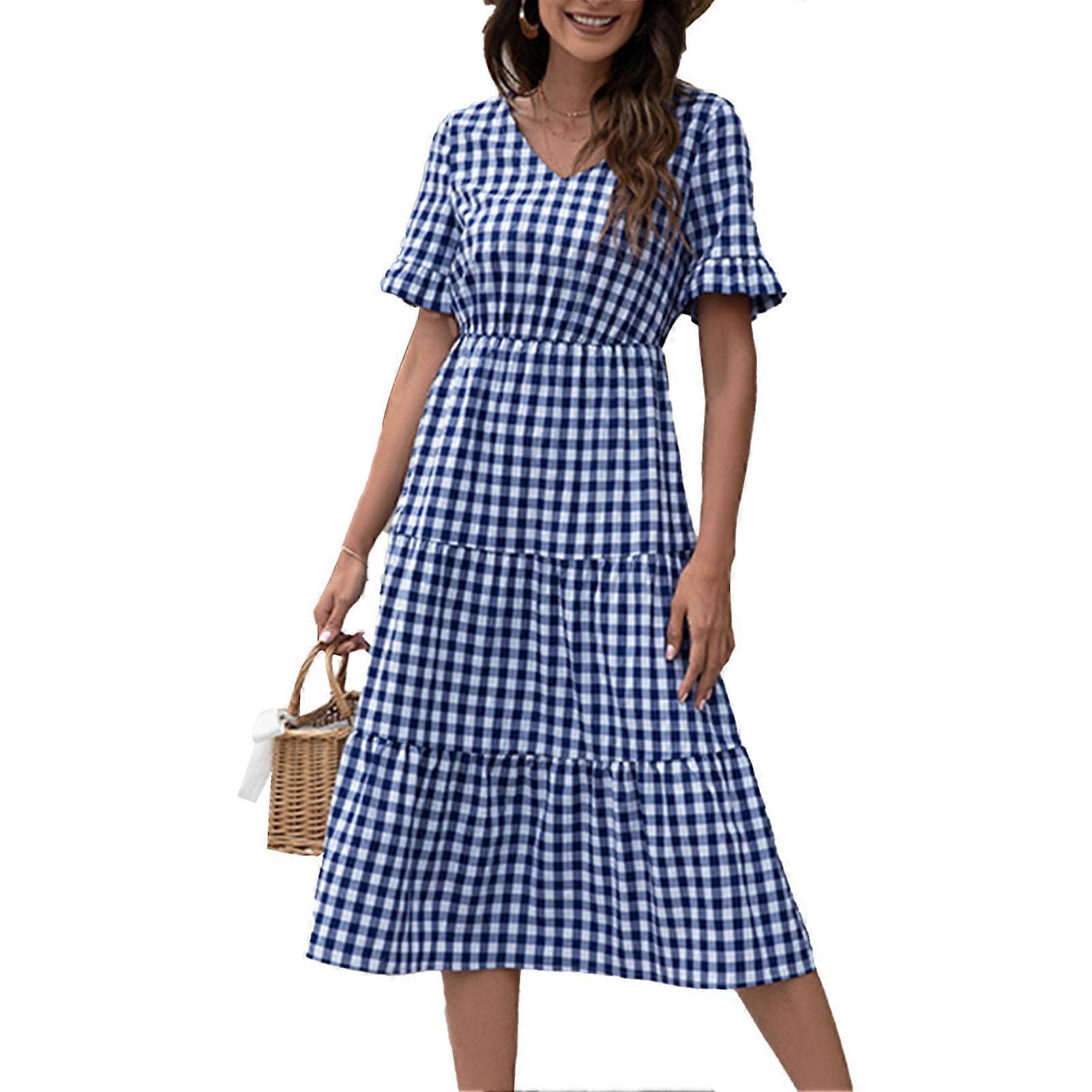 1、Plaid Print: The checkered print design highlights your nifty and cute, which is a classic and generous look will never go out of style. 2、Big Swing: The big swing dress hem design flowing and light, allowing you to be comfortable while not losing elegance. 3、Ruffle Sleeve: The ruffled cuffs will hide the excess flesh on your arms, highlighting your beautiful arm line and adding to the lively summer feelings. 4、V Neck: The v neck design highlights your beautiful neck line and reveals your charming collarbone, making your temperament stand out in the crowd. 5、Slightly Waist: The slightly waist skimming design highlights your waistline and doesn't feel too tight, instead shows off your perfect curves. 6、Occasion: This must have dress for hot weather is perfect for casual, everyday wear, vacations, beaches, vacations, weddings, offices, family gatherings, etc. 7、Match: Create a stylish look with sandals, high heels, casual shoes, hats, belts, handbags and other fashion items. Item Type: Dress Material: 95% polyester and 5% polyurethane Washing: Machine Washing Neckline: V Neck Sleeve: Short Sleeve Style: Casual Season: for summer Size Details: S: Length: 115cm / 45.28in, Bust: 93cm / 36.61in, Waist: 66cm / 25.98in, Shoulder: 39cm / 15.35in, Sleeve: 24cm / 9.45in M: Length: 116cm / 45.67in, Bust: 97cm / 38.19in, Waist: 70cm / 27.56in, Shoulder: 40cm / 15.75in, Sleeve: 24.5cm / 9.65in L: Length: 117.5cm / 46.26in, Bust: 103cm / 40.55in, Waist: 76cm / 29.92in, Shoulder: 41.5cm / 16.34in, Sleeve: 25cm / 9.84in XL: Length: 119cm / 46.85in, Bust: 109cm / 42.91in, Waist: 82cm / 32.28in, Shoulder: 43cm / 16.93in, Sleeve: 25.5cm / 10.04in 2XL: Length: 120.5cm / 47.44in, Bust: 116cm / 45.67in, Waist: 89cm / 35.04in, Shoulder: 44.5cm / 17.5in, Sleeve: 26cm / 10.24in 1 x Dress