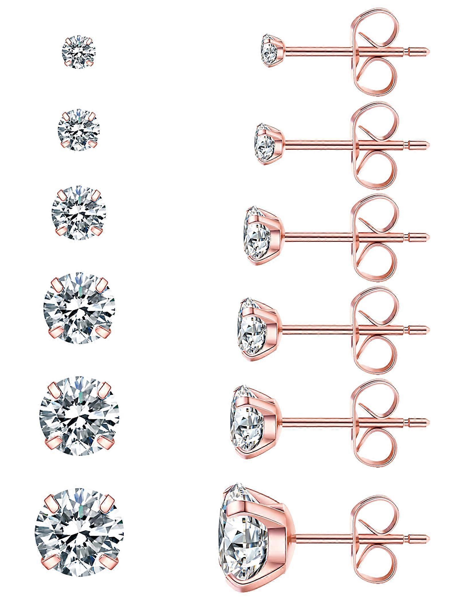 Rose Gold Stud Earrings Set, Stainless Steel, 6 Pairs, Stackable Cubic Zirconia, Waterproof for Women