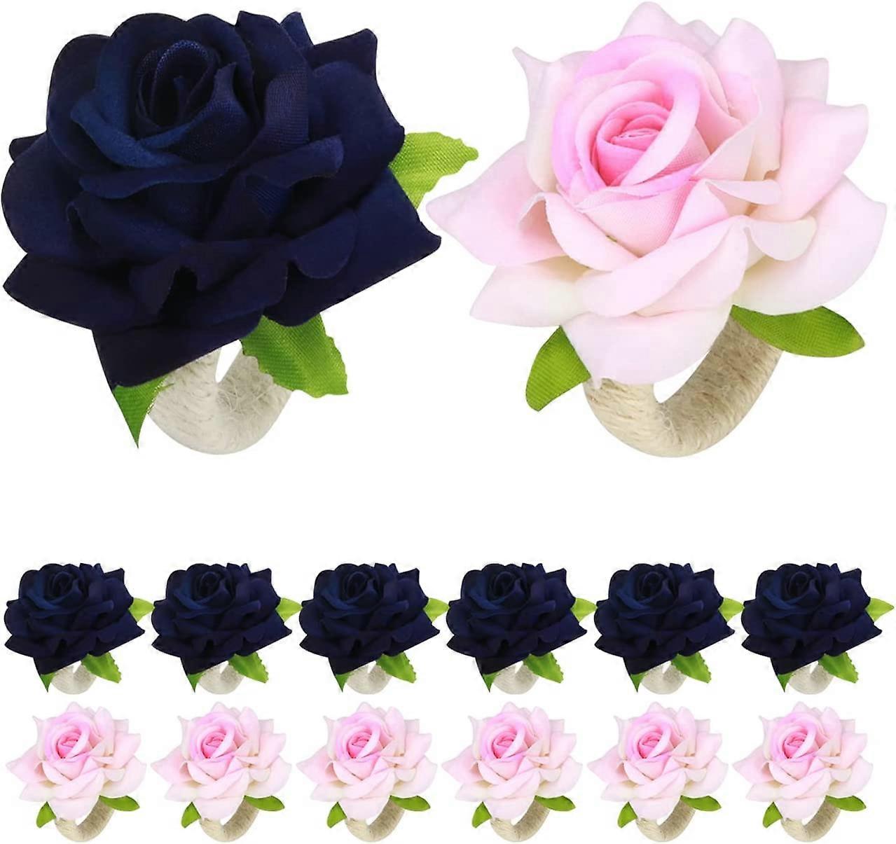 Rose Napkin Ring Flower Napkin Ring Wedding Napkin Decoration for Christmas, Banquet, Hotel, Restaurant 12 Pieces (Pink+Blue)