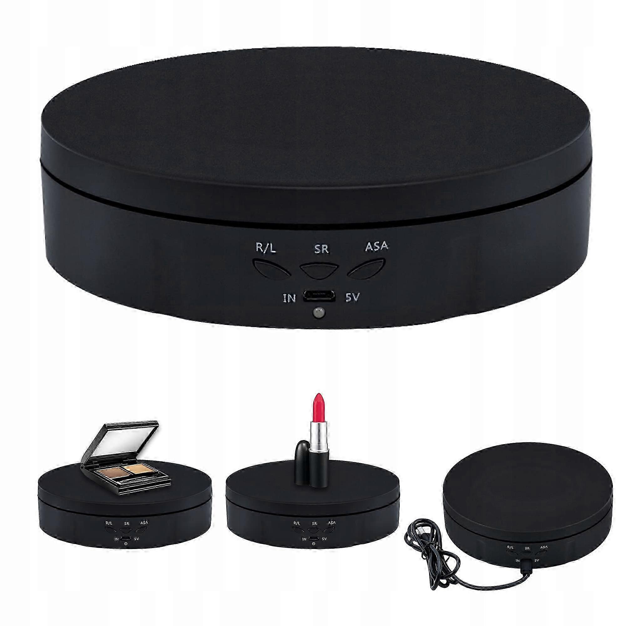 CHARACTERISTICS: Material: The electric stand is mainly made of ABS, with solid structure, non-toxic, sturdy and durable. Turntable: Three-speed speed control, three-angle display (90,180,360). 50-70 decibels, does not affect video recording. Wide application: The rotating display stand is ideal for displaying jewelry, watches, electronic products, bags, models, gems and collectibles. Give the customer a 360-degree view of your product and let the photographer take photos in a 360-degree view. INSTRUCTIONS FOR USE: 1. Power ON: touch any button. 2. R or L: switch right or left. 3. SR: speed adjustable, 2r or 4r or 6r or min. 4. ASA: angle adjustment, 90 or 180 or 360 rotation. 5. IN 5V: Micro USB 5V DC IN. 6. power off: long press any button for 3 seconds. 7. 8. charging LED indicator (built-in): red - charging, green - fully charged. Specification: Colour: black Material : ABS Diameter : 14.5 cm Height: 3.5cm Load capacity: 8kg The package includes: 1xrotary table 1xusb cable