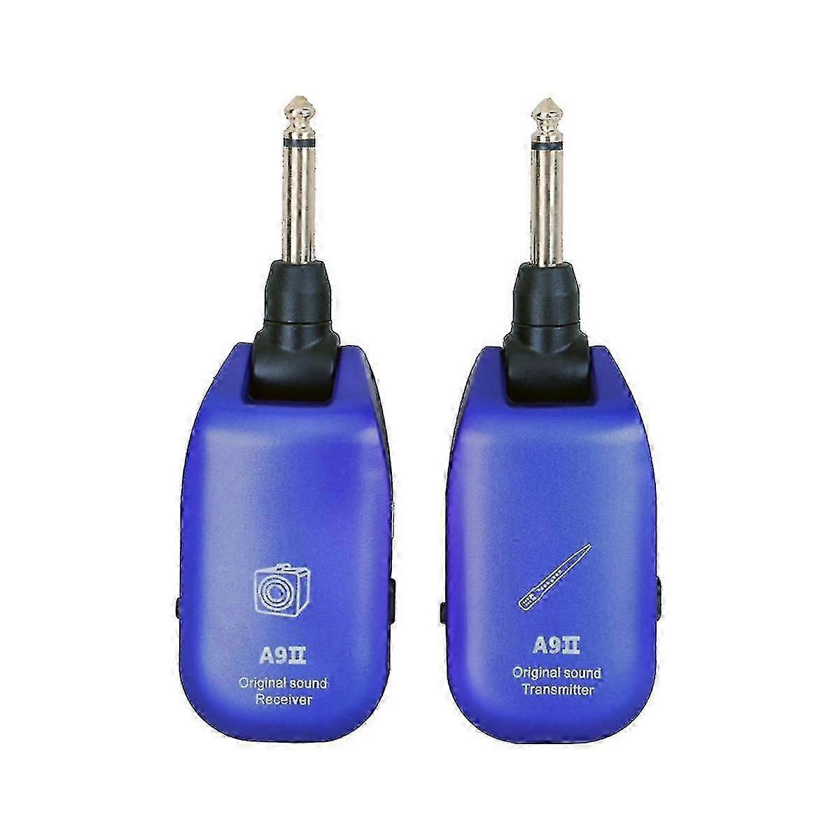 and high quality Wireless transmitter and receiver set designed for electronic music instruments like guitar, bass, etc. Built-in rechargeable battery, long working hours, and comes with USB cable for convenient recharging. Wireless Guitar System has compact size and .Wireless Guitar Transmitter Receiver is easy to carry.This wireless guitar system supports one-to-one mode or one transmitter to several receiver mode. Digital Guitar Wireless Transmitter is available for most electric guitars, bass, electric-acoustic guitars,Electronic organ. even suitable for guitars with vibrato system. Response Range:20Hz-20kHz. Frequency:UHF 730MHz. Transmission Range:Max.50M (No obstacle); 30M (through-wall). Transmission Delay:Less Than 4ms. Power Supply:Built-in 3.7V 600mAh rechargeable lithium battery. Charge Port:-USB. Charging time:2 hours Colour:Blue Material:ABS Size:11x4.5x1.5cm/4.3x1.8x0.6inch Package Contents: 1 * Guitar System Transmitter 1 * Guitar System Receiver Only the above package content, other products are not included. Note: Light reflection and different displays may cause the color of the item in the picture a little different from the real thing. The measurement allowed error is +/- 1-3cm.