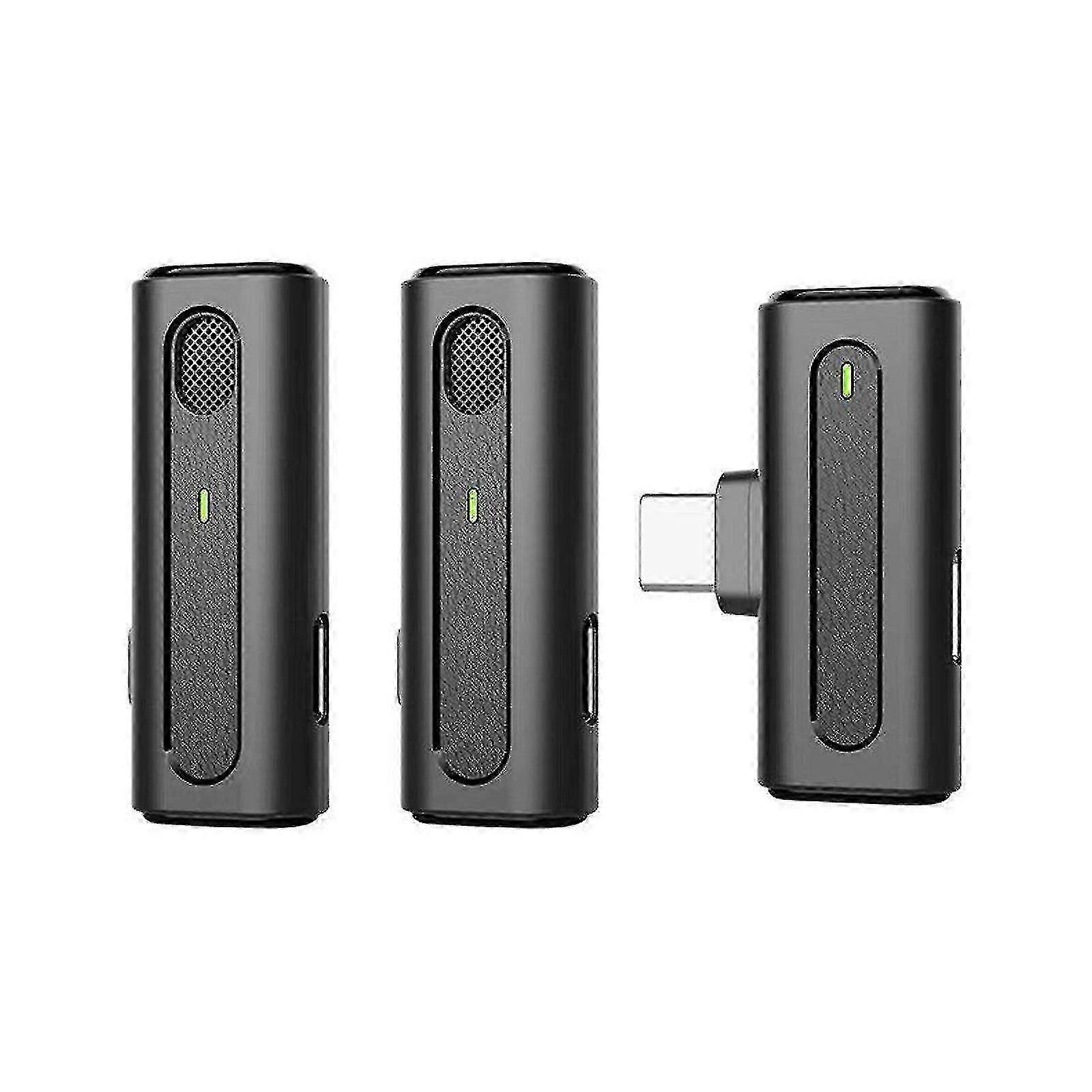 Wireless Lavalier Type-C Microphone 2.4GHz Clip-on Lapel Mic with Charging Case for Vlog Interview Podcast Noise Cancellation Auto Sync Low Latency(Plug-Play) Specification: Product Name: Wireless Microphone Product color:Black Material: ABS Gross weight: 0.13lbs(60g) Microphone size:4.6x1.6x1.6cm/1.81x0.63x0.63inch Receiver size: 4x1.6x0.8cm/1.57x0.63x0.31inch Package size: 12.2x9.3x3cm/4.80x3.66x1.18inch Features: Lavalier microphone for type-c devices ,mobile phones, tablets and cameras etc. 2.4G wireless technology, plug and play after power on, no need for cumbersome operation New noise-cancellation, pure voice reproduction, built-in DSP noise reduction chip, strong anti-interference ability, clearer radio, so that the audience's voice is in the realm of reality The microphone contains 80mah battery, long life, wireless live recording short video are suitable for, lavalier wear, microphone o-nly weighs 10g/0.35oz, super light and no burden Plug and play 35m unobstructed reception, active noise cancellation, clear sound quality, high sensitivity, wide C-OMPATIBILITY Craftsmanship, compact and comfortable lavalier clip-on microphone, upgraded anti-jet metal mesh Function indicator, real time display, slow flashing low battery alarm, charging blue light always on, automatic pairing after key C-LICK G-REEN light always on pairing success Package Include: 1x Wireless Microphone 1x Type-c Receiver 1x USB Cable
