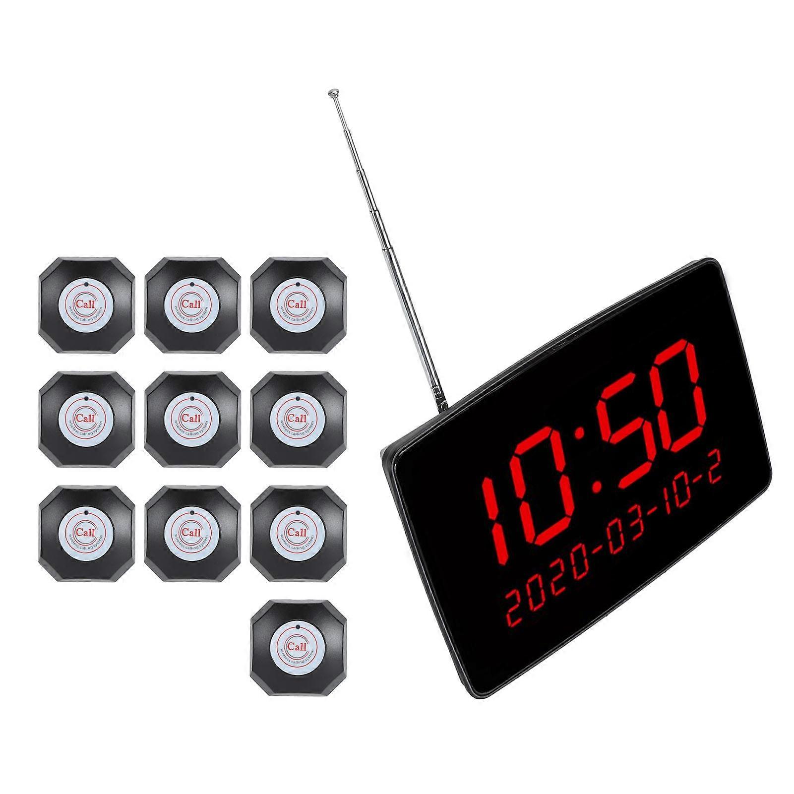 Wireless Calling System Time Display Restaurant Paging Table Bells with 10 Buttons 1 Receiver for Hotel Bar Hospital EU Plug