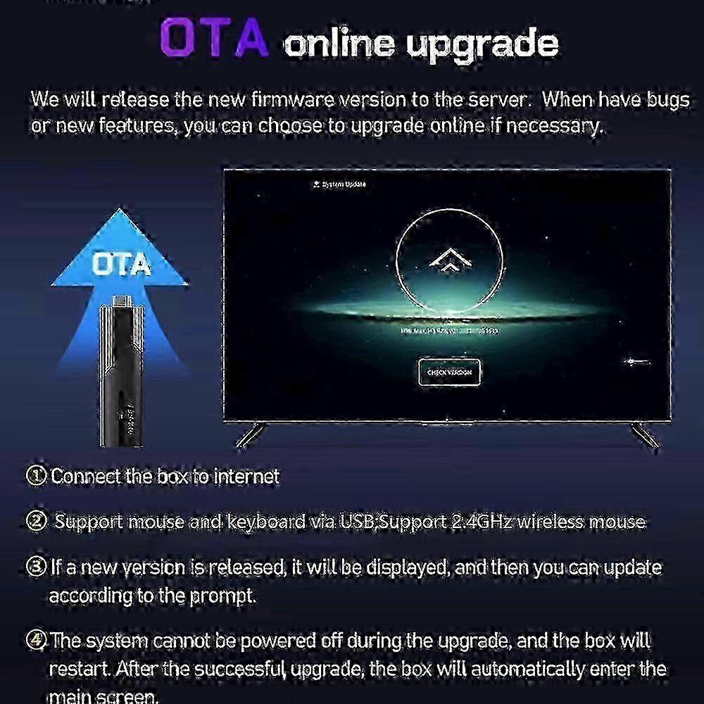 Android 13 TV Stick 4K with Dual-Band WiFi - Streaming Media Player for Google, YouTube, Netflix Android 13.0 TV Stick 4K 1080P 2.4/5G Dual WiFi Smart TV Stick for Google YouTube NETFLIX Network Media Player Features: [Android 13.0] Higher quality output, Powerful graphics processor, Stable performance [Enjoy it on the big screen and the best speaker] Your video/music/photo from your Android devices/IOS devices through DINA/Airplay/note big screen. Enjoy the best gast gaming &entertainment experience [Breathe life into your TV] With the Gocast TV dongle, you can play games Enjoy movies, watch games and screen sharing, and breathe life into your TV [Beautiful Ul Clean and tidy] The newly designed operating system is simpler to use and runs more smoothly Specifications: CPU: Allwinner H618 64 bit quad core ARM Cortex A53 CPU GPU: G31 MP2 GPU processor Resolution standard: 4K Rom capacity: 16GB Ram capacity: 2GB Wi-Fi version: 802.11b, 802.11g, 802.11n Bluetooth version: Bluetooth4.0 Operating system: Android 13.0 Bluetooth Support: Yes HDMI: HDMI/4K * 2K UHD output, HDMI 2.1 OTG: OTA Upgrade Support USB PORT: USB 2.0/SD/DC/OTG/HD Optics: Digital audio output IR: IR Receiver/Remote Receiver Connect Power: Micro USB 5V/1.5A, LED Indicator, Working: Blue; Standby: Network Attachment: TV stick * 1 Voice remote control * 1 HDMI cable * 1 Instruction manual * 1 Packaging box * 1 Note: Due to the light and screen setting difference, the item's color may be slightly different from the pictures. Please allow slight dimension difference due to different manual measurement.