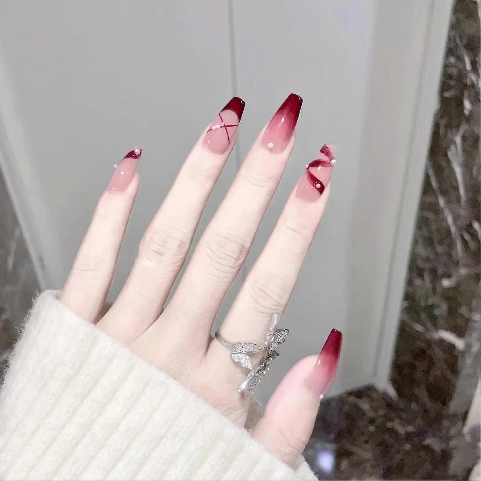 Wine Red Gradient Ballerina False Nails Acrylic French Removable Adhesive Nails Jelly Glue Model