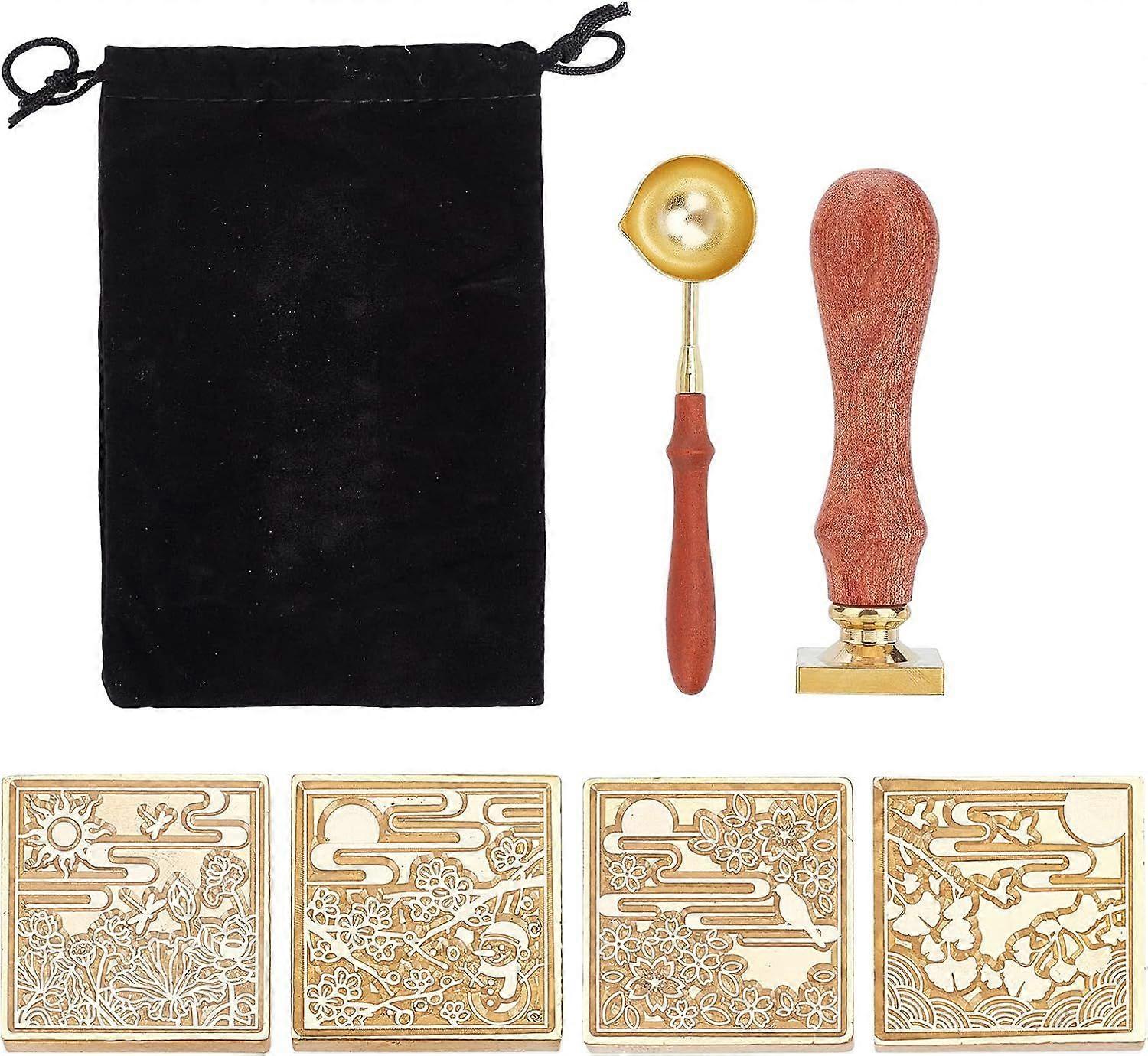 Wax Seal Stamp Set 4PCS Square Sealing Stamp Heads 4 Seasons with 1 Piece Universal Wood Handle Wax Melting Spoon and Velvet Pouches for Invitations C