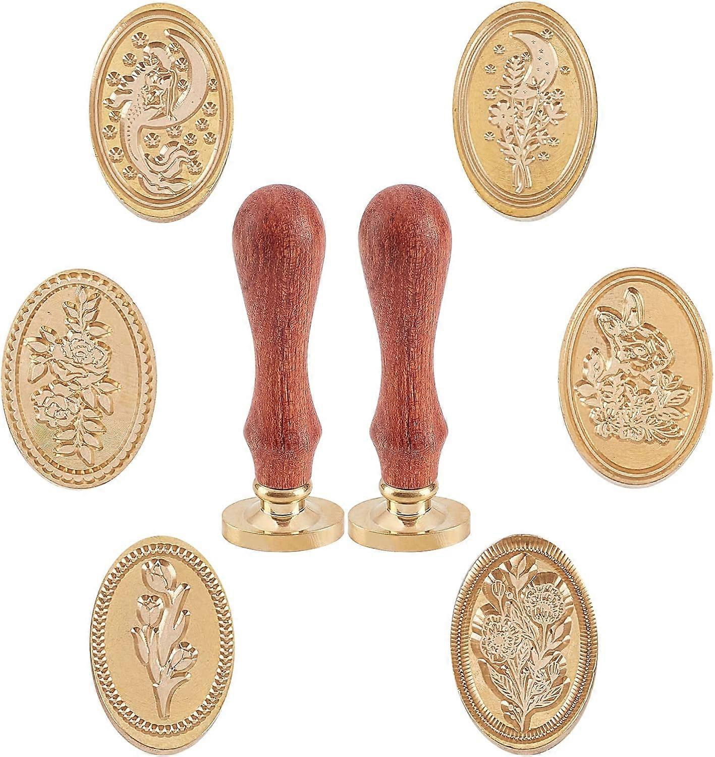 Wax Seal Stamp Set 6PCS Oval Sealing Stamp Heads with 2PCS Universal Wood Handles 2030mm Brass Stamp Heads Set for Invitations Cards Birthday Gift Dec