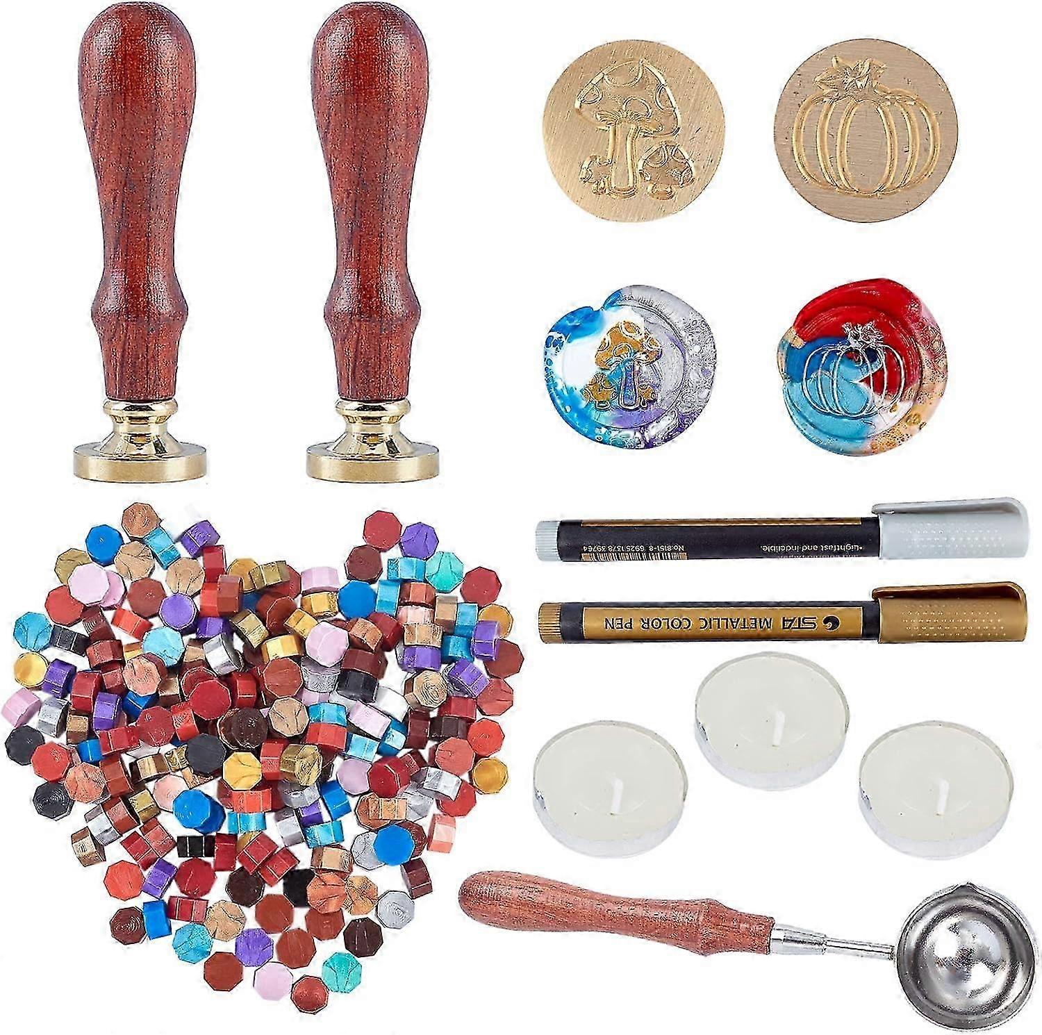 Wax Seal Beads Kit 200Pcs Sealing Wax Beads 2Pcs Wax Seal Stamp Pumpkin and Mushroom 2Pcs Marker Pen 3PCS Candles Wax Melting Spoon for Wax Sealing St