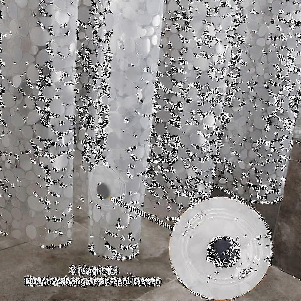 Quality: 0.2mm thick compared to other 0.15mm shower curtains is much higher quality. Our shower curtain is made of environmentally friendly EVA material, 100% non-toxic and odorless, offers you a healthy shower room. It is heat-resistant and, despite the heating, also undeformed and also has better flexibility than normal shower curtains made of PEVA. Property: Because of the humid and warm environment in the bathroom, mold increases particularly quickly. Do not worry Thanks to the high-quality EVA plastic, this shower curtain provides optimal waterproof, anti-mold and quick-drying properties. Cleaning: This shower curtain is very easy to clean. You only need to regularly wipe the surface of the shower curtain with a damp cloth or sponge and then let it air dry. Thanks to the high-quality EVA material, it is very easy to remove the shampoo and shower gel residues Design: This shower curtain is equipped with 12 rustproof metal eyelets and corresponding plastic rings, so it is suitable for straight or curved shower bars and does not make any scratching noise. 3 magnets at the bottom make folding easier. Modern 3d design, semi-transparent cobblestone pattern keep your privacy well. It will be a great choice for families or hotels. Package content: - 1 x shower curtain - 12 x shower curtain rings (diameter: 28mm) Note: - Regularly wipe the surface of the shower curtain with a damp cloth or sponge and then let it air dry. - Thanks to the high-quality material, it is very easy to remove the shampoo and shower gel residues. - Size: 180 x 200cm - Dense: 0.2 mm - Net weight: 714 g - Color: semi-transparent