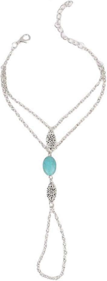 Hollow Carved Flower Faux Turquoise Harness Hand Chain Ring Link Bracelet for Women Banquet Festival Dcor