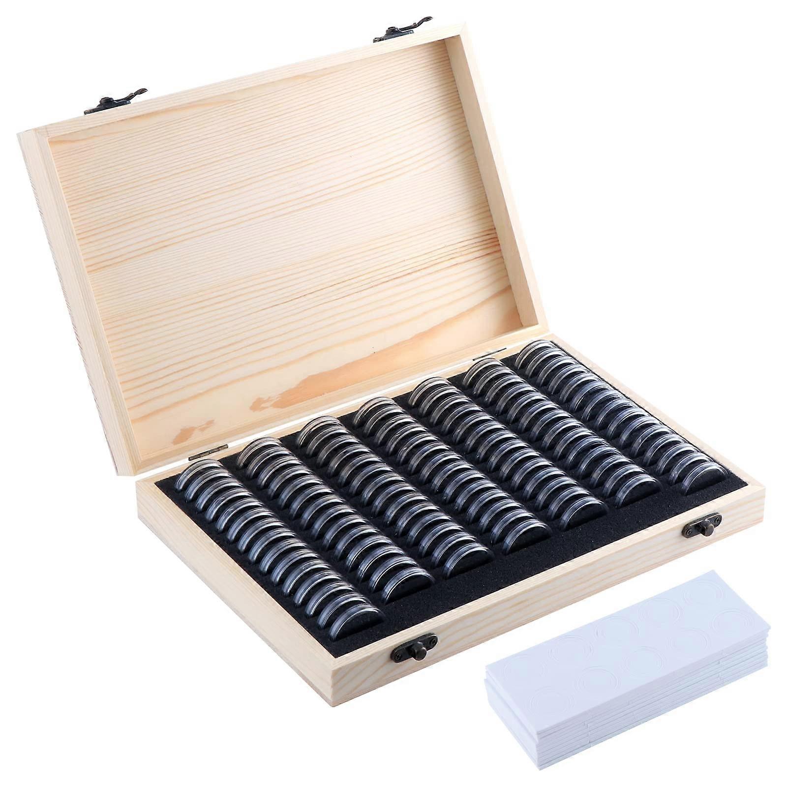 100PCS Wooden Storage Boxes with Round Coin Capsules, Coin Storage Box with Plastic Organizer for Coin Collectors