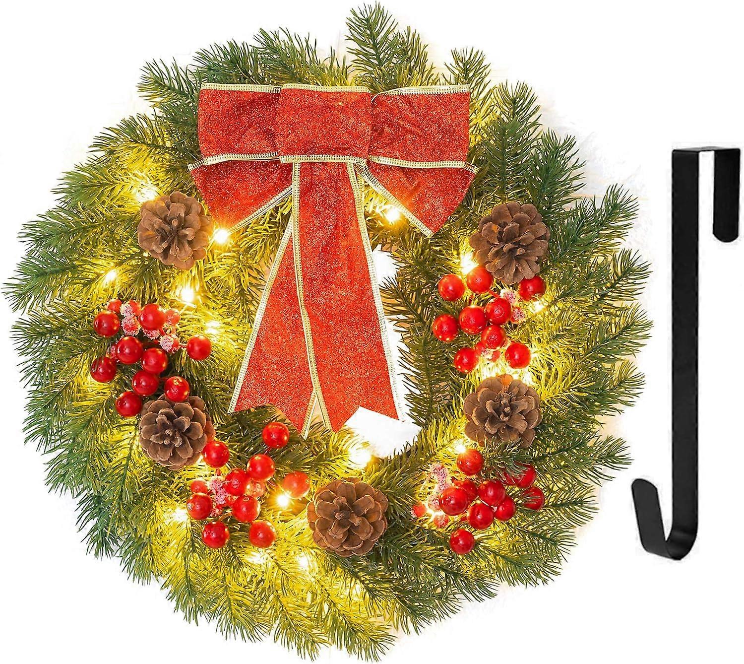 Pre-lit Artificial Christmas Wreath, 40 LED 16 Inch Spruce Berries Pine Cone Garland with Red Bows Artificial Holly Leaves Xmas Wreath with Hanger for