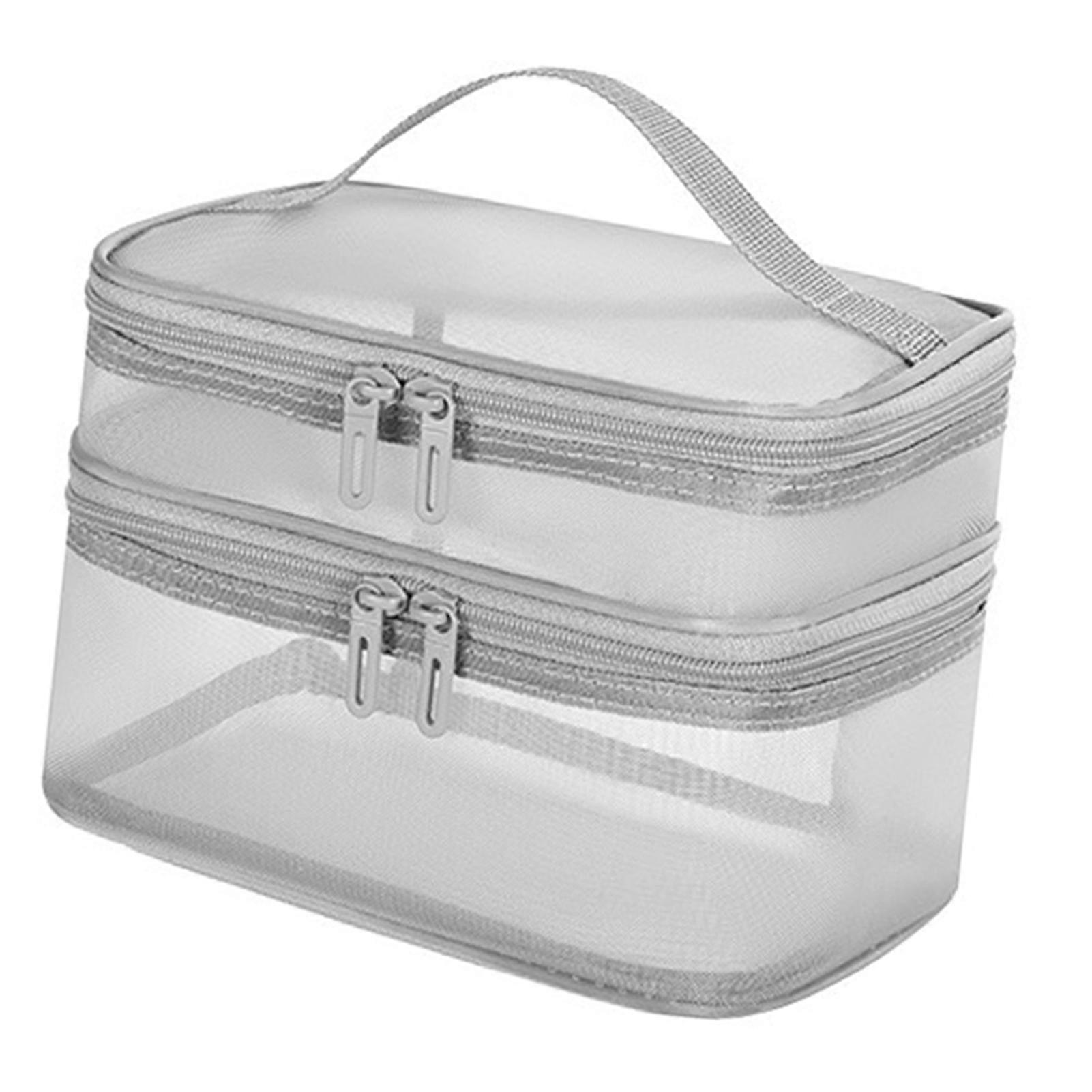 Double Layer Cosmetic Bag Easy Classification Large Capacity Mesh Cosmetic Bag with Sturdy Handle for Travel Grey Double Layer