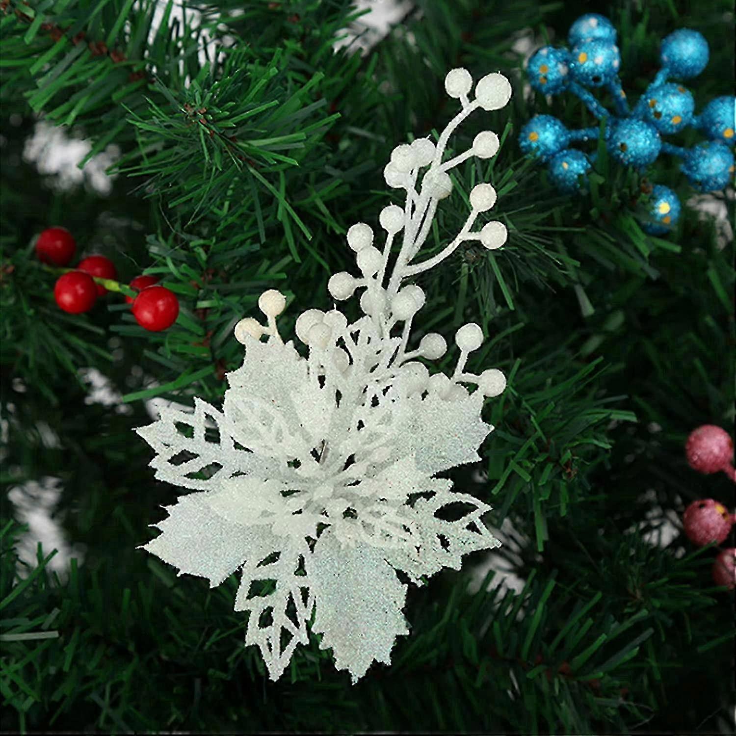Set of 10 Artificial Poinsettia Christmas Decorations with Metal Alloy Clips & Glitter, 15cm