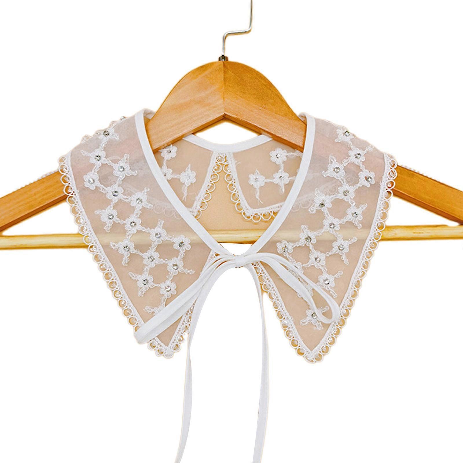 Women Sheer Mesh for Doll Detachable Collar Shawl Crystal Beaded Embroidery Diamond Flower Scarf Sequins Lace Trim Capel White