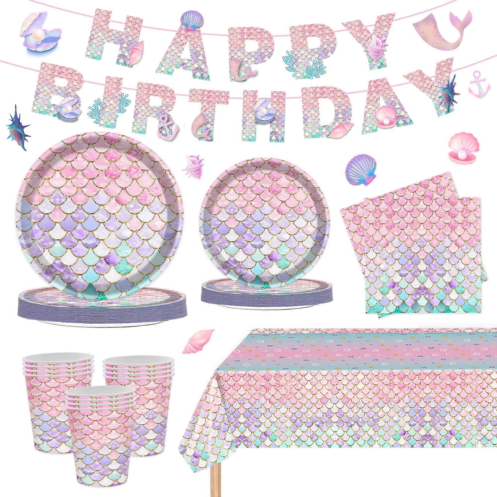 Mermaid Birthday Party Decorations Set with Plates Napkins Cups Tablecloth and Banner for Kids' Celebrations