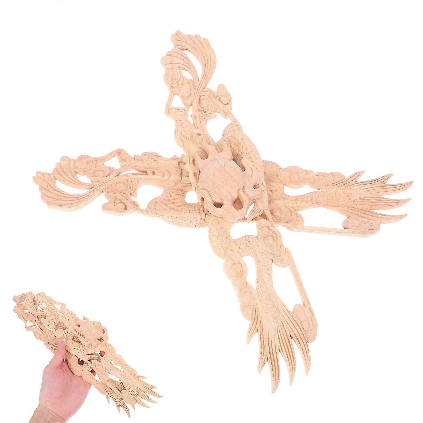 Wood Carved Dragon Applique 2Pcs For Furniture Decoration And Cabinet Door Enhancement In Beige Wood With Finish