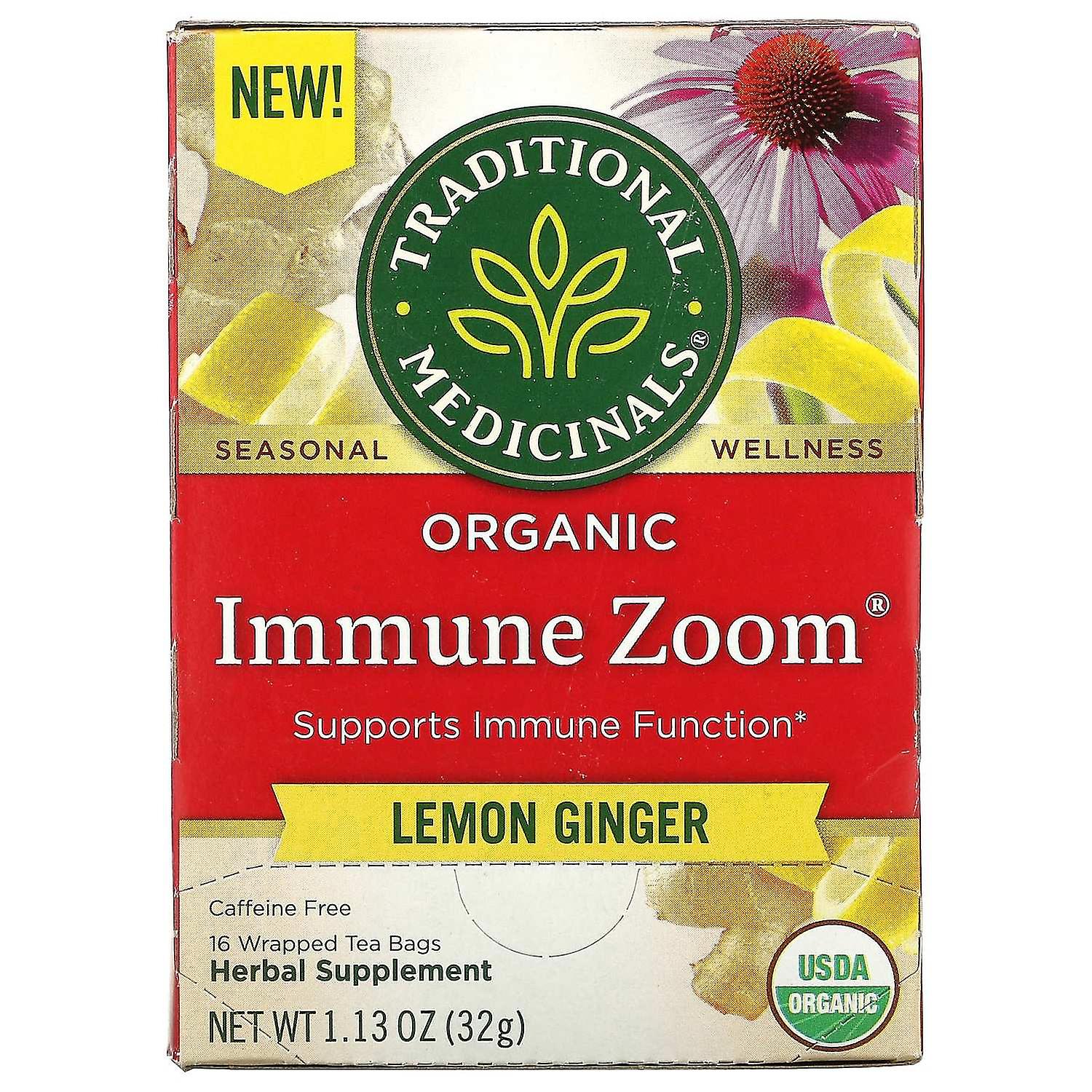 Traditional Medicinals, Organic Immune Zoom, Lemon Ginger, Caffeine Free, 16 Wrapped Tea Bags, 1.13
