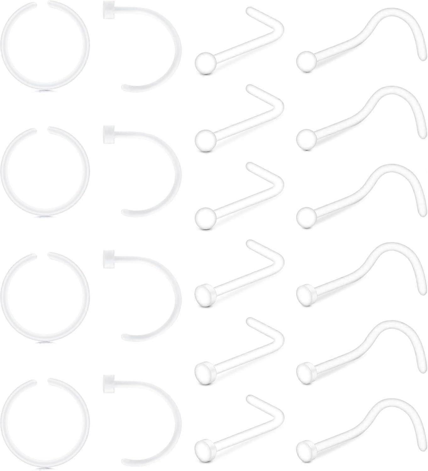 MATERIAL. Made of healthy acrylic material, never hurt your body skin, and felixble piercing jewelry, clear design that convenient to wear, giving you a better wearing experience. FEATURE. Clear plastic retainer for piercings are good for work, surgery and more. Bioflex feature also comfortable to wear. Best present for women / men / youself / lover / friends on Birthday, Anniversary day, Valentine's day, Halloween, Christmas etc. DIMENSIONS.Clear nose rings hoops: 20g(0.8mm), inner diameter: 5/16"(8mm); Clear nose rings studes: 20g(0.8mm),bar length: 7mm, top ball dia.: 2mm; C shaped colorful nose rings retainer: 18g(1.0mm), inner diameter: 5/16"(8mm) WARRANTY. Any issues with our items, please feel free to contact us. We will try our best to help you out. PACKAGE INCLUDES. 4Pcs clear nose rings hoops, 4pcs C shaped nose rings retainer, 6pcs L shaped clear nose studs, 6pcs screw plactic nose studs with one black velvet bag.