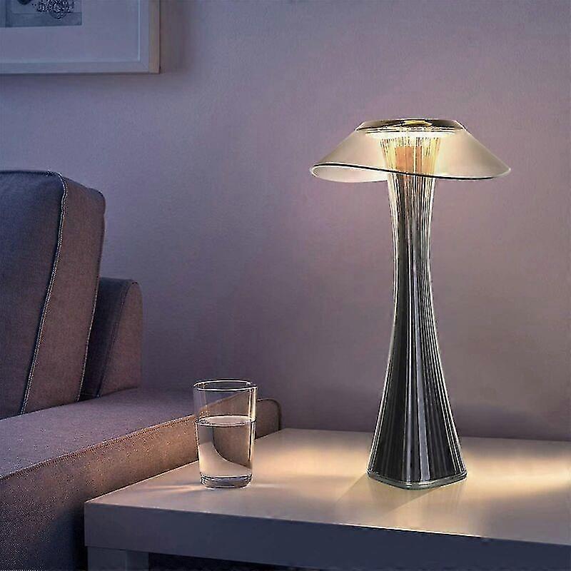Modern table / bedside lamp with tactile dimmable function --smoke gray The LED bedside lamp from not only impresses with its modern and transparent exterior, but also with its interior values, such as than a long battery life. The lamp body and the shade are made of different plastics (PMMA and ABS), some of which are transparent, others opaque. Space is turned on and off by touching the top area of the screen. It is mainly emitted towards the table surface, so that there is no unpleasant glare or indirect lighting. Rosegold plastic body, it achieves a wonderfully decorative effect, which is enhanced by turning on the lamp. Because then the warm white LED light begins to reflect beautifully on the clear PMMA screen. DETAIL Tactile bedside lamp It can be set up to 3 different light temperatures (warm white, natural white and cool white) so that you can individually select the optimum brightness level compatible each occasion. ABS plastic and PMMA This table lamp is made of high quality ABS plastic and the PMMA end caps can be used in every apartment without hesitation. The exquisite appearance and reliable quality make the lamp a satisfactory choice. Durable LED light source The LED table lamp has a very powerful battery, which can light you up compatible up to 10 hours . The 16 LEDs illuminate any environment with bright light, even when there is no outlet nearby. Compact and small, this elegant light illuminates every dark niche. Application area indicator light on and off The LED table lamp is available in two colors: rose gold and smoked gray.
