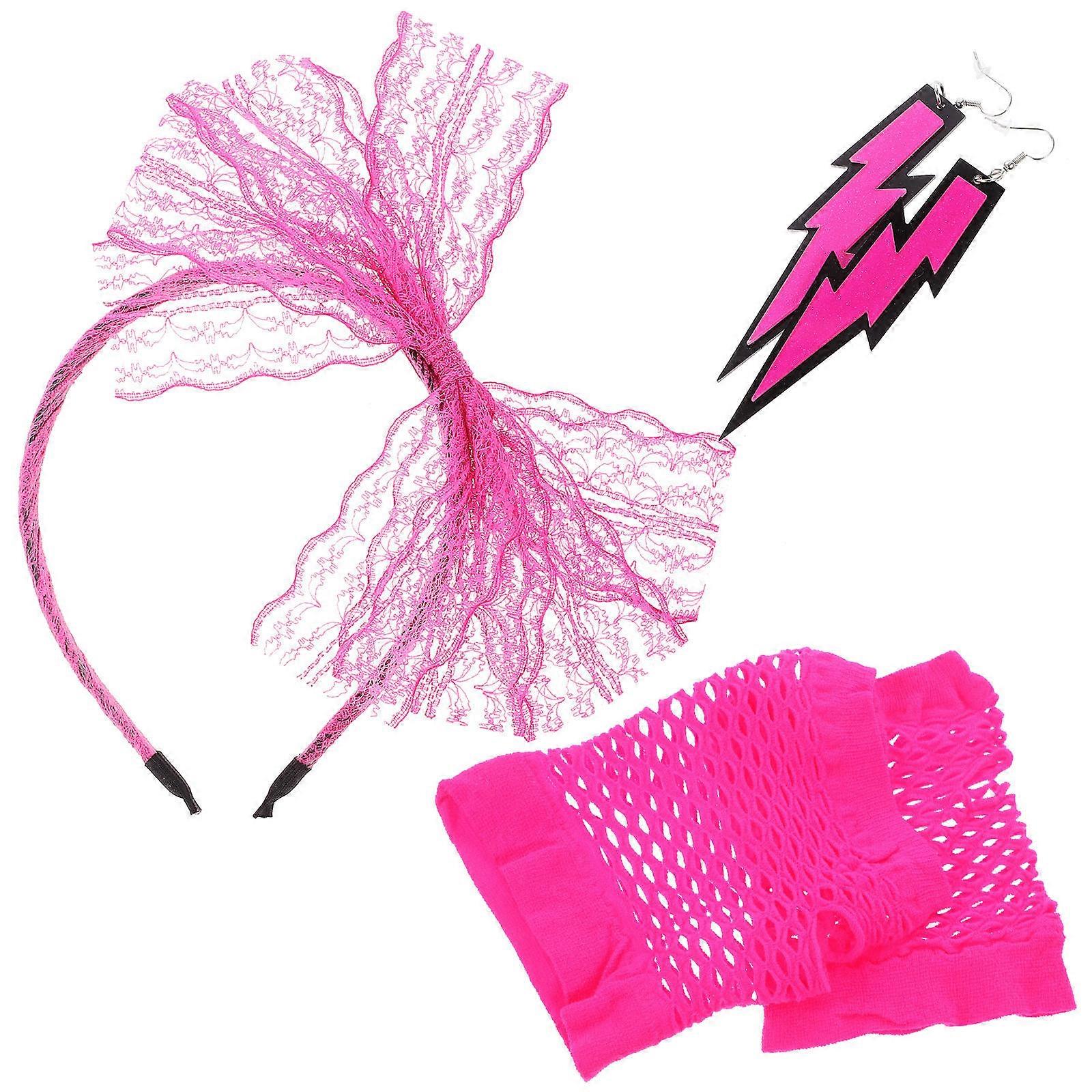 Throwback Accessories Lace Headband Neon Earrings Fingerless Gloves for 80s Party Rosy Fishnet Pattern 1Set