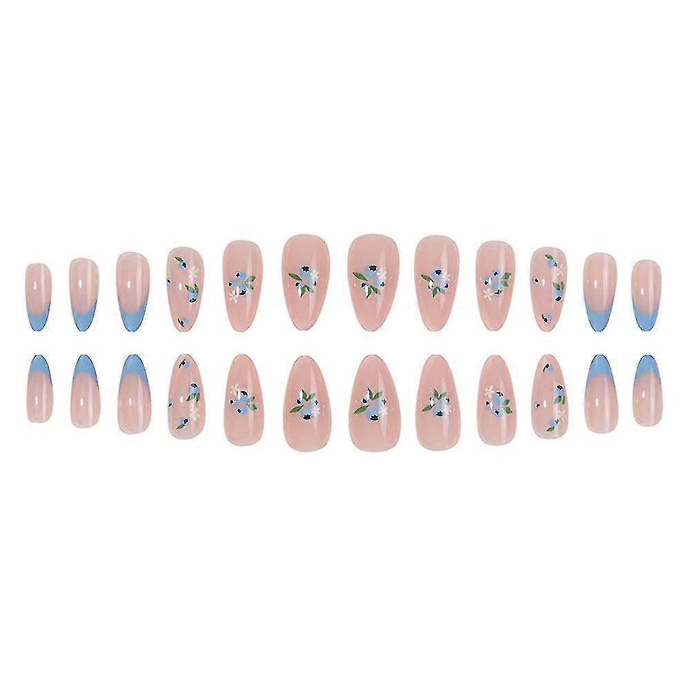 Glossy Press On Nail Pink Color Blue Tips Nail With Small Flowers