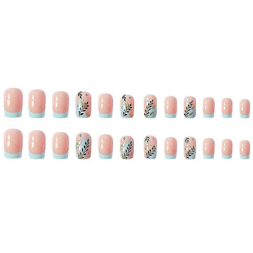 Glossy Press On Nail Pink Blue Maple Leaves Nail With Gold Glitter Jelly Glue Model