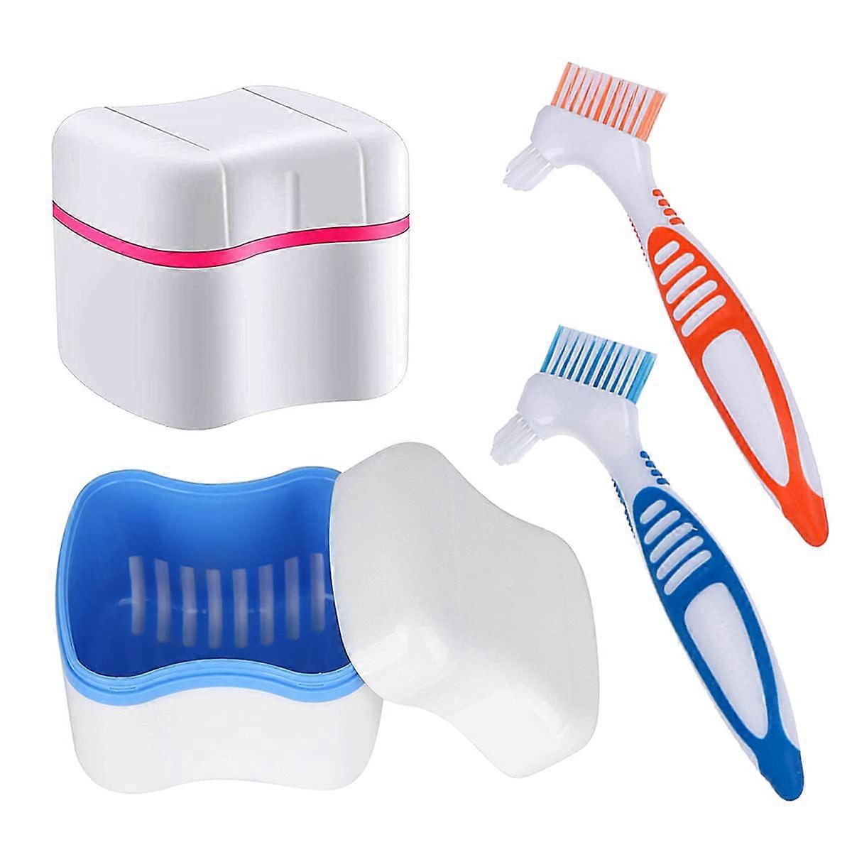 Denture Cleaner Box and Brush Set - 2 Pack Denture Bath Case with Basket + 2 Pack Denture